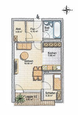 这套两室一厅的小公寓面积约为 47 平方米,分区十分合理。明亮的起居室通向阳台,清晨阳光普照,公园美景尽收眼底。厨房与客厅巧妙地融为一体。明亮的卧室可容纳一张双人床。带浴缸的浴室铺设了明亮的瓷砖。实用的储藏室提供了充足的储物空间,走廊上还可放置衣柜。